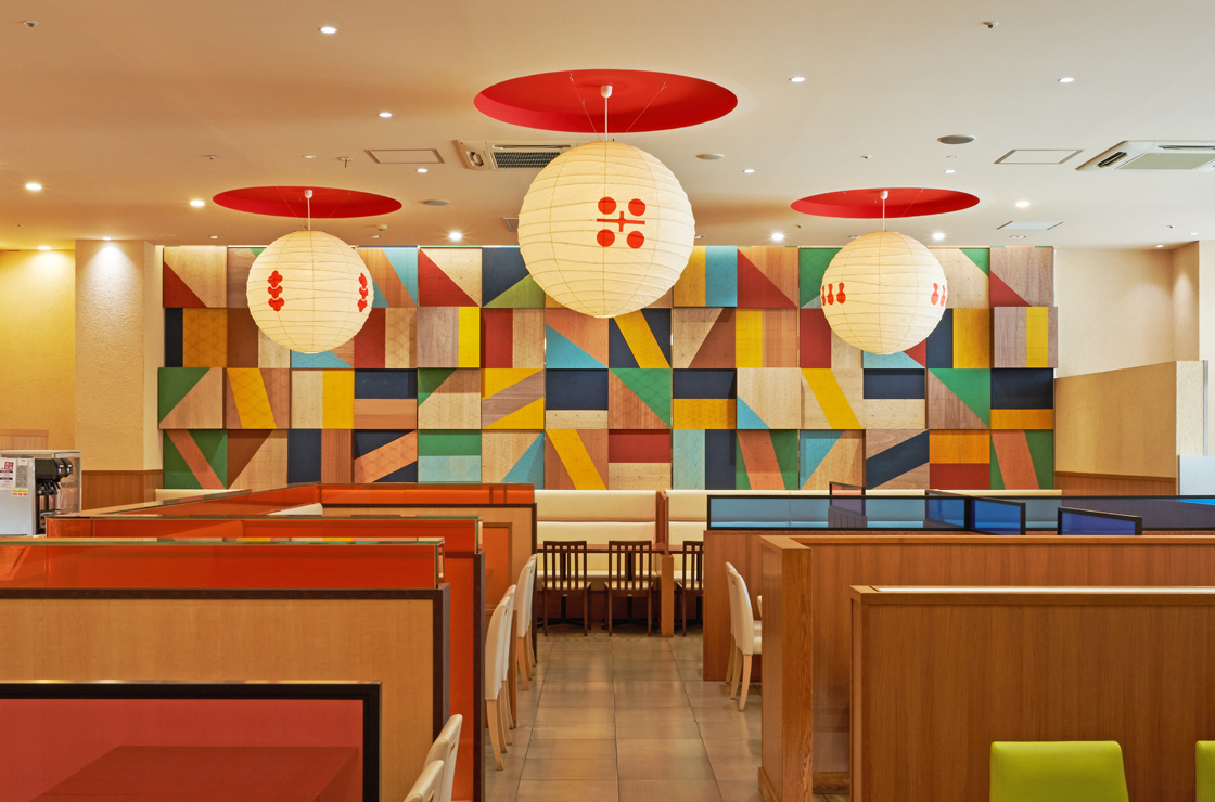 店舗のコンセプトを元に、日本をイメージさせる赤と紋のロゴを作成。店舗全体を明るいイメージにするため、 店舗装飾のカラーも調整しました。