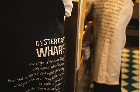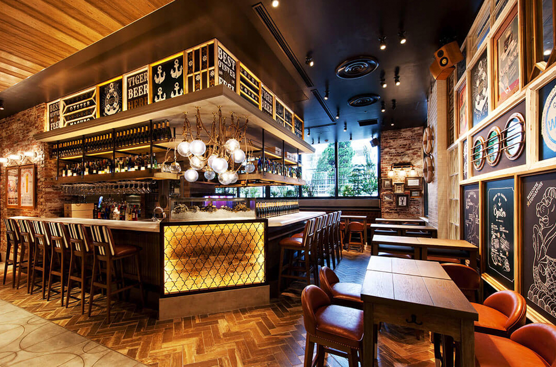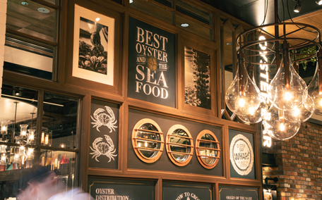 シンガポールや海、オイスター、シーフードをカジュアルに楽しんでもらえるように手書きの文字やイラストを使ってデザインを組み立てました。 壁面の何十枚もあるイラストもデザイナーが手書きしたものです。